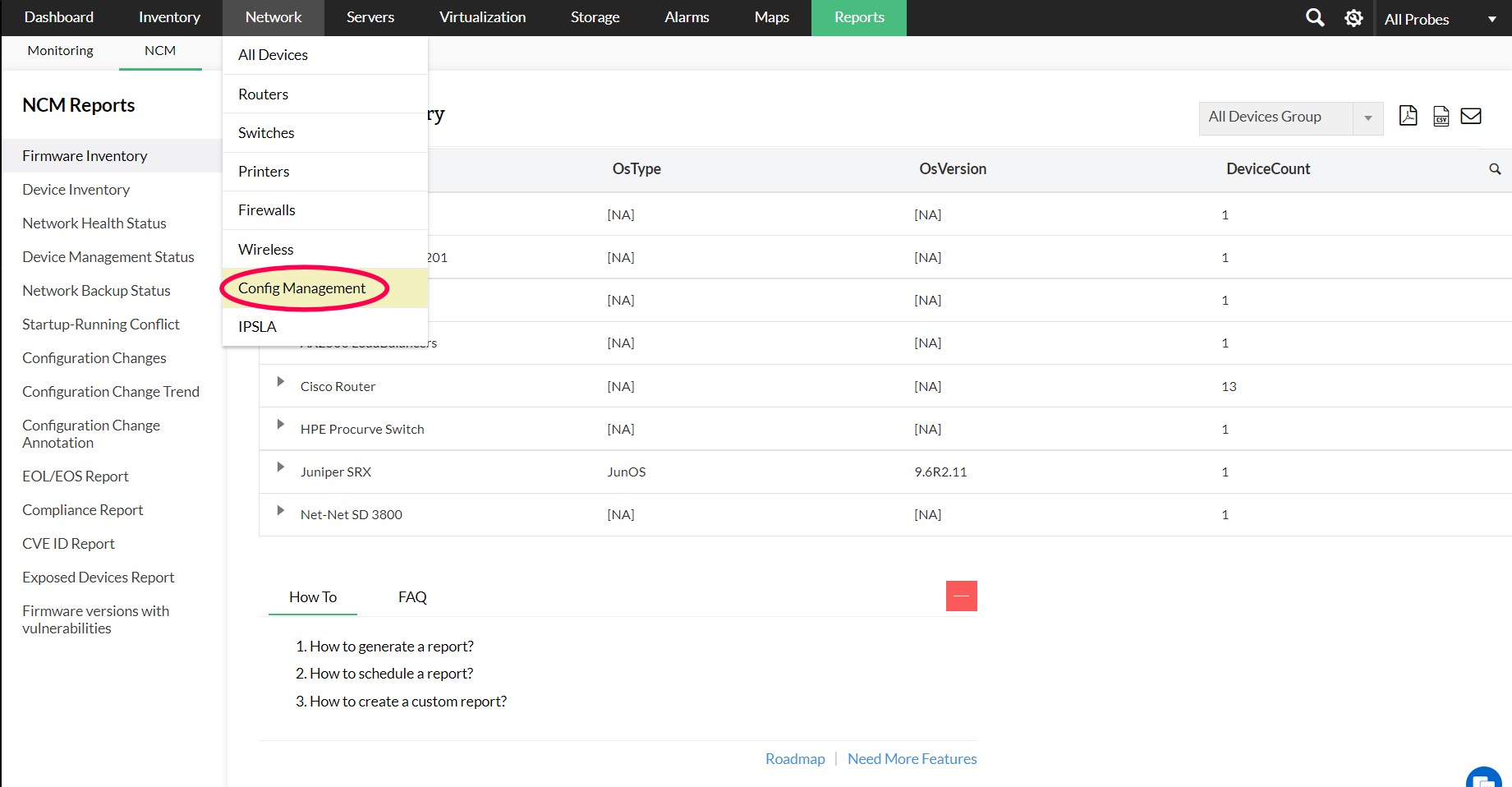 Secure your network from firmware vulnerabilities and prevent business losses and customer attrition as a consequence of intrusions and data hacks with the help of the NCM feature. Scan and identify firmware vulnerabilities in client network devices and fix them instantly. This feature also delivers a detailed view of the vulnerabilities included with the CVE ID, and that provides a suitable patch to overcome vulnerabilities.