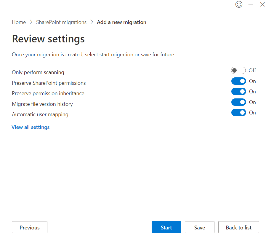 Reviewing settings before migration in the SharePoint Migration Tool