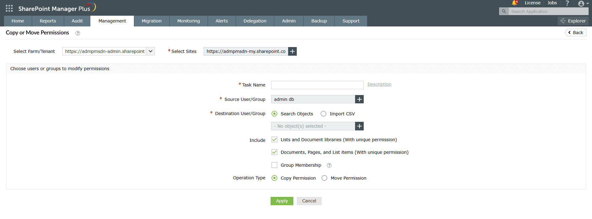 SharePoint Manager Plus makes permission management easy with a script-free GUI. Granting, copying, and removing permissions can be done quickly with a CSV file import. Granularly granting access to only specific files can be achieved with a point-and-click operation. SharePoint Manager Plus also helps you check permissions to locate privilege escalation, delete orphaned users, and perform other essential tasks—all from a single console, eliminating back-and-forth navigation.