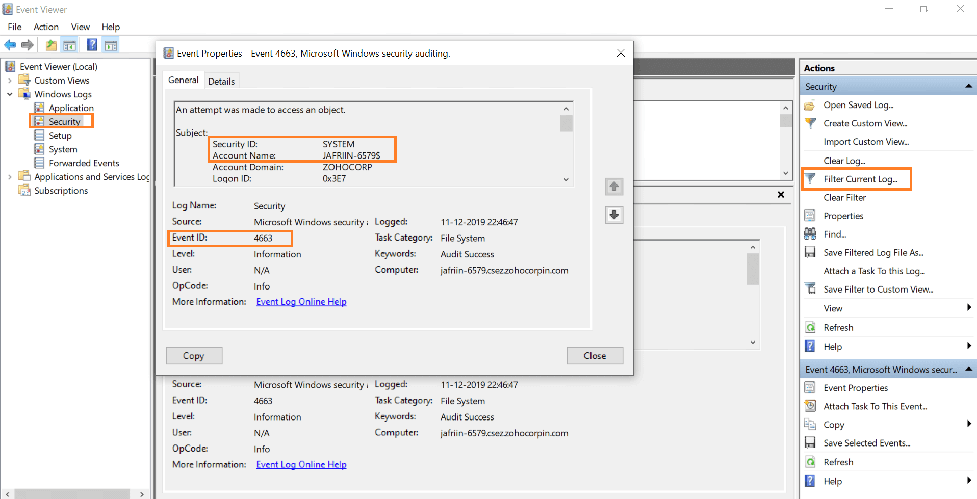 - Ga naar Gebeurtenislogboek en definieer de: