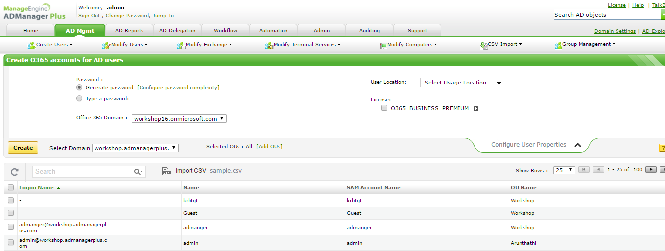 NB: Met ADManager Plus kunt u niet alleen gebruikers maken in AD en Office 365, maar ook in G Suite, Exchange Server en Skype voor Bedrijven / Lync / LCS / OCS, in één snelle bewerking.