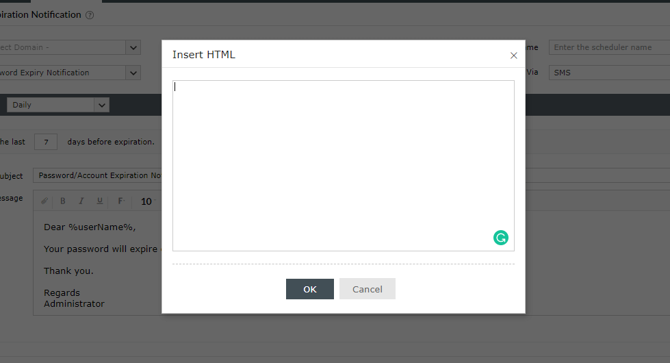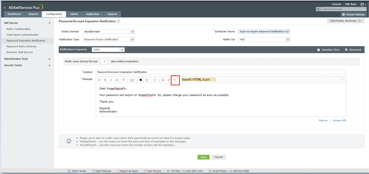 ADSelfService Plus verstuurt e-mailmeldingen, zoals melding van verlopen wachtwoord, herinneringen voor registratie, enz., als tekst zonder opmaak. U kunt ADSelfService Plus configureren om e-mailmeldingen in html-indeling te verzenden.