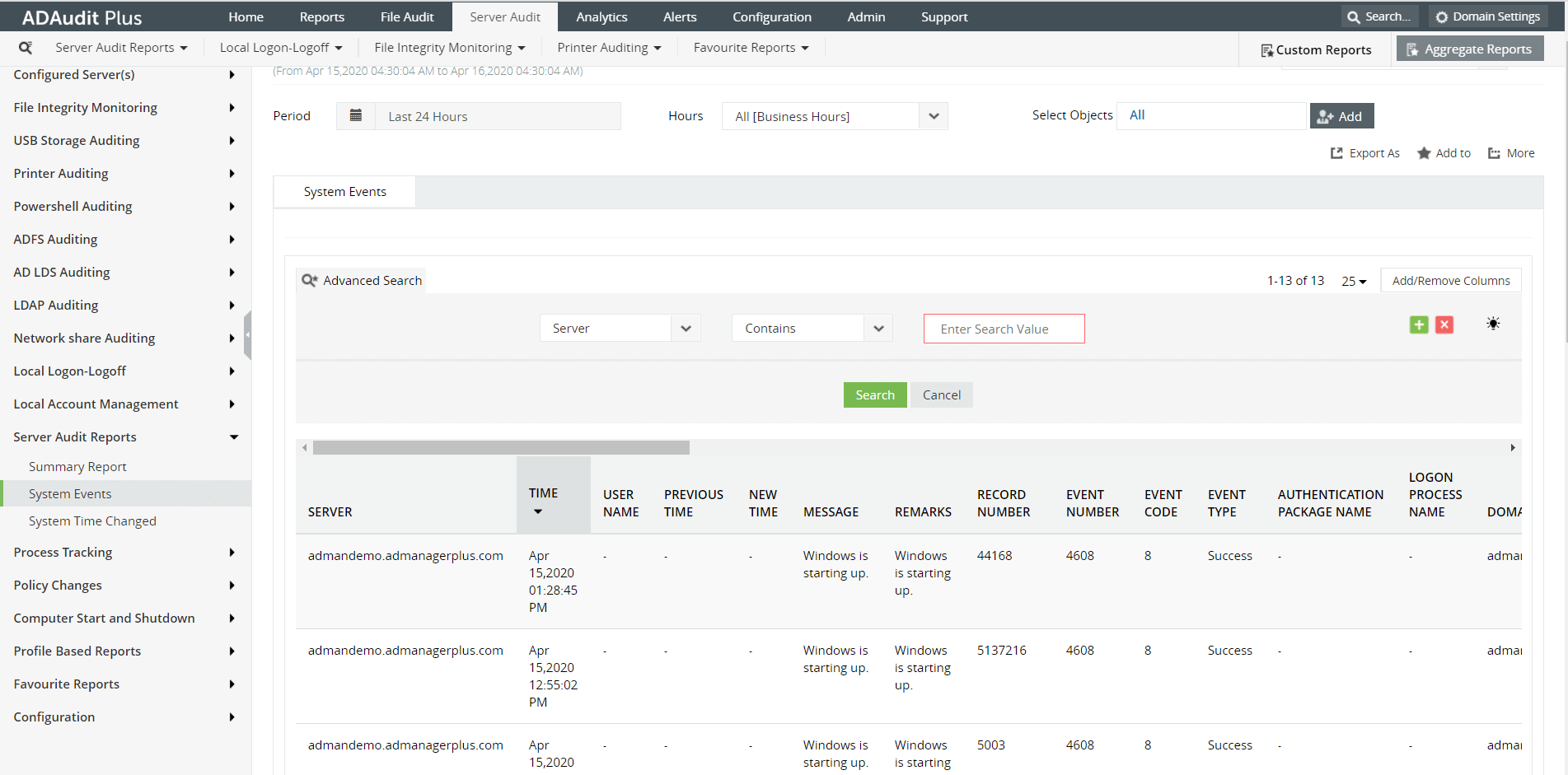 Apesar do bom desempenho que Get-WinEvent oferece para recuperar seus dados, ainda faz sentido procurar uma solução mais rápida que exija menos esforço, mas que também forneça relatórios detalhados de log de eventos. O ADAudit Plus é uma solução que vem com uma interface fácil para identificar relatórios relevantes. Ele vem com uma funcionalidade de pesquisa integrada para rastrear facilmente eventos específicos. A seguir está uma comparação que mostra como você pode recuperar logs de eventos usando o PowerShell e o ADAudit Plus.
