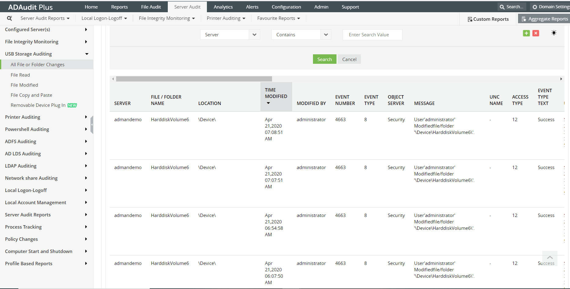 Você também pode realizar uma pesquisa filtrada por "servidor", "nome do filtro/pasta", "local", "modificado por" e "mensagem". Esses filtros ajudam a identificar qualquer evento específico que você esteja procurando.