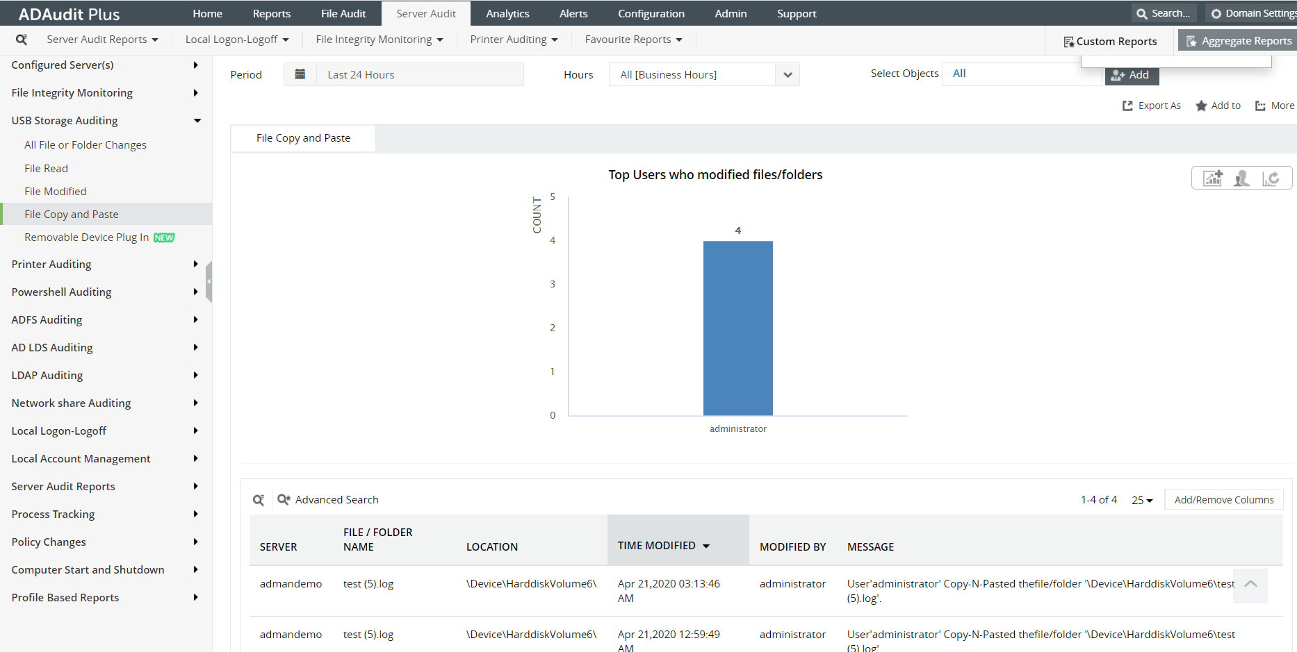 Isso fornece vários relatórios sobre "Todas as alterações de arquivos e pastas", "Leitura de arquivo", "Arquivo modificado", "Copiar e colar arquivo", "Plug-in de dispositivo removível".