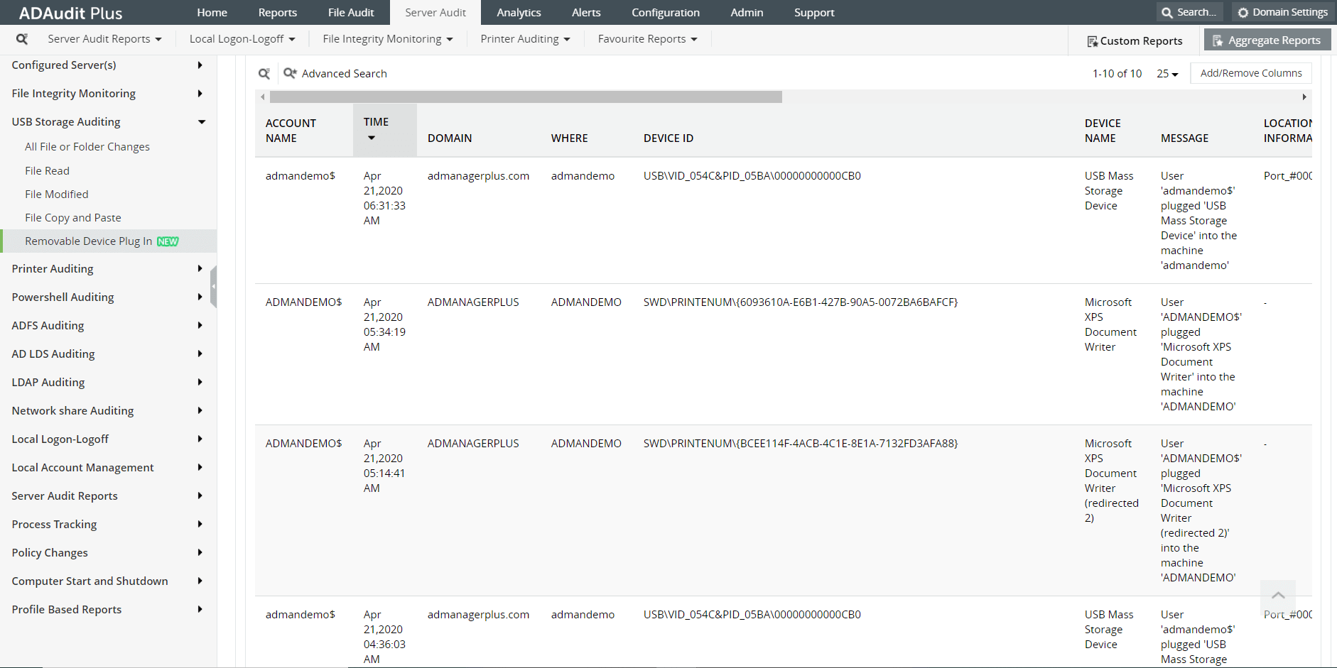 - O ADAudit Plus oferece suporte a máquinas de 32 e 64 bits para fornecer vários relatórios em dispositivos de armazenamento removíveis.