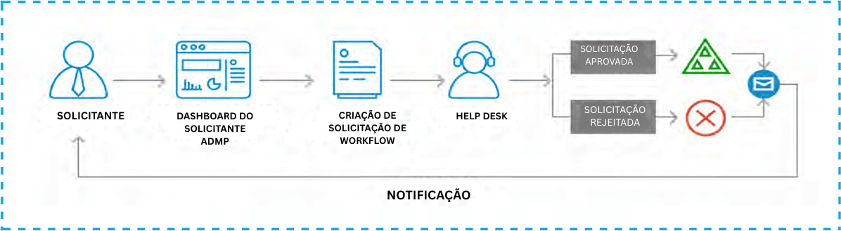 Para superar esses desafios, o ADManager Plus disponibiliza um processo de solicitação via workflow que alivia a carga do administrador de TI (Fig. 1). Assim, os usuários podem registrar pedidos diretamente, sem precisar acionar o administrador por e-mail ou ticket e, como os próprios solicitantes informam suas necessidades, o workflow garante que as solicitações sejam processadas sem erros. Os administradores também podem usar SLAs de workflow para priorizar solicitações sensíveis, garantindo execução no prazo ou reatribuindo conforme necessário.