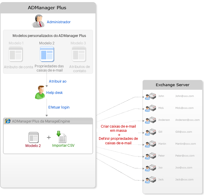 No cenário acima, o administrador de TI, com base nas suas inúmeras responsabilidades no Gerenciamento do Active Directory, decide delegar algumas de suas tarefas de Gerenciamento do Exchange aos help desks da organização. No entanto, ele também deseja ter controle total sobre todas essas tarefas e garantir que elas sejam realizadas de maneira eficiente e segura. Para conseguir isso, ele utiliza os modelos personalizados fornecidos pelo ADManager Plus, configura-os com as propriedades que precisam ser definidas para a caixa de e-mail do usuário e, em seguida, vai atribuí-los a um dos técnicos do help desk (que pode até ser um funcionário amador da organização). O técnico do help desk efetua o login no ADManager Plus, apenas importa um arquivo CSV com os atributos de usuário necessários e aplica o modelo atribuído. Dessa maneira, uma grande quantidade de caixas de e-mail do Exchange foi criada e suas propriedades foram definidas rapidamente - tudo isso sem modificar ou elevar os direitos do help desk no Active Directory ou Exchange Server! É assim que você transforma um amador, não especialista em TI, em um administrador do Exchange!
