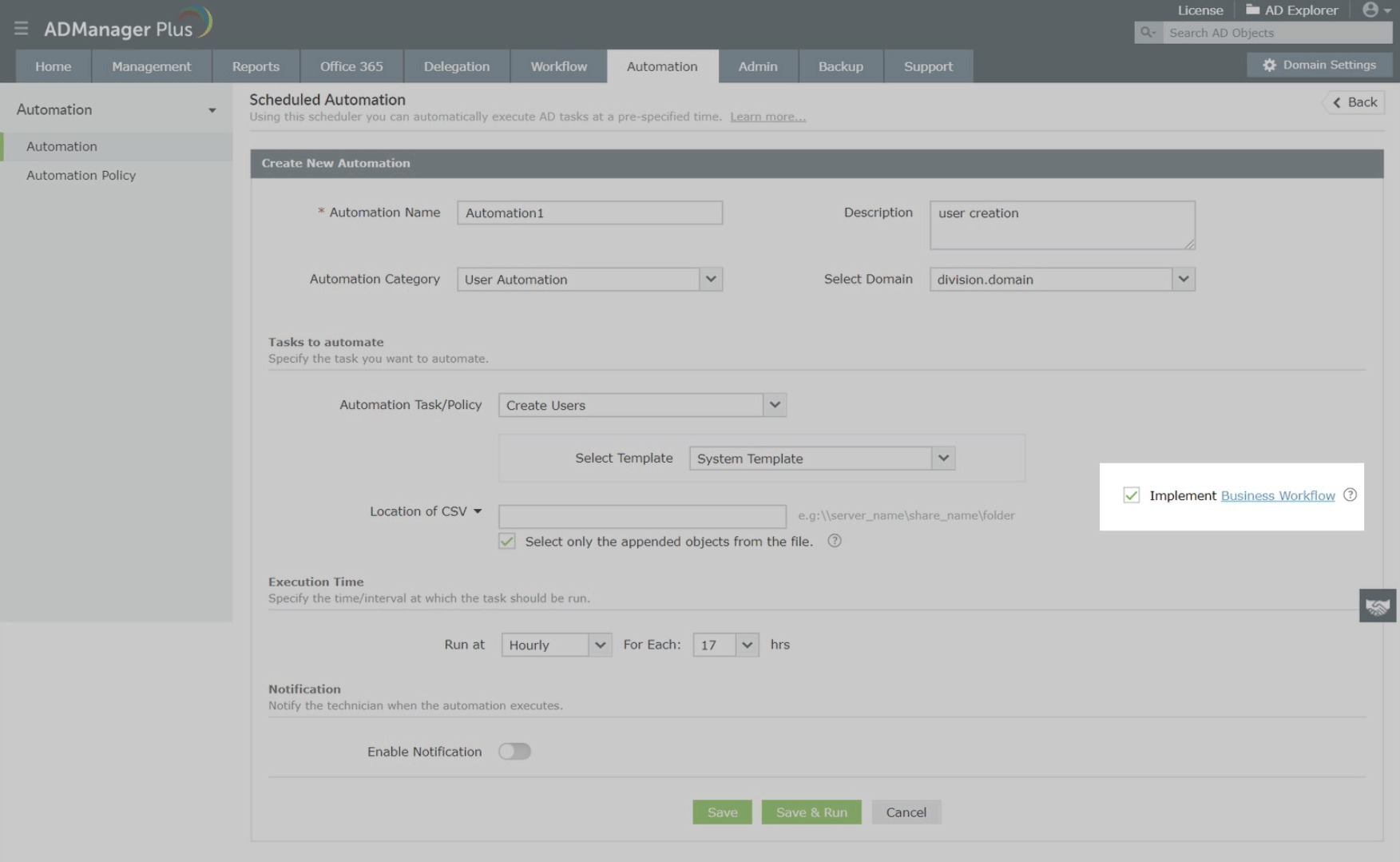 Agora, o processo é iniciado sempre que um arquivo CSV novo ou atualizado é descoberto pela automação durante sua execução agendada. Ele conclui a criação e notifica o administrador ou, no caso de uma automação controlada (uma automação implementada pelo Fluxo de Trabalho de Negócios), gera um relatório organizado das contas de usuários a serem criadas e aguarda o Revisor (conforme definido no fluxo de trabalho implementado), que simplesmente precisa dar aprovação após ver a solicitação.