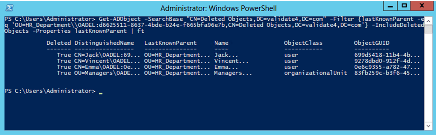 Get-ADObject -SearchBase "CN=Deleted Objects,DC= validate4,DC=com" -Filter {lastKnownParent -eq 'OU=HR_Department,DC= validate4,DC=com'} -IncludeDeletedObjects | Restore-ADObject