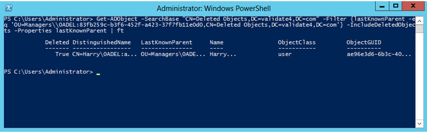 Get-ADObject –SearchBase "CN=Deleted Objects,DC=validate4,DC=com" -Filter {lastKnownParent -eq 'OU=Managers\\0ADEL:83fb259c-b3f6-452f-a423-37f7fb11e0d0,CN=Deleted Objects,DC= validate4,DC=com'} -IncludeDeletedObjects -Properties lastKnownParent | ft