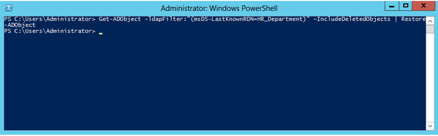 Get-ADObject -ldapFilter:"(msDS-LastKnownRDN=HR_Department)" –IncludeDeletedObjects | Restore-ADObject