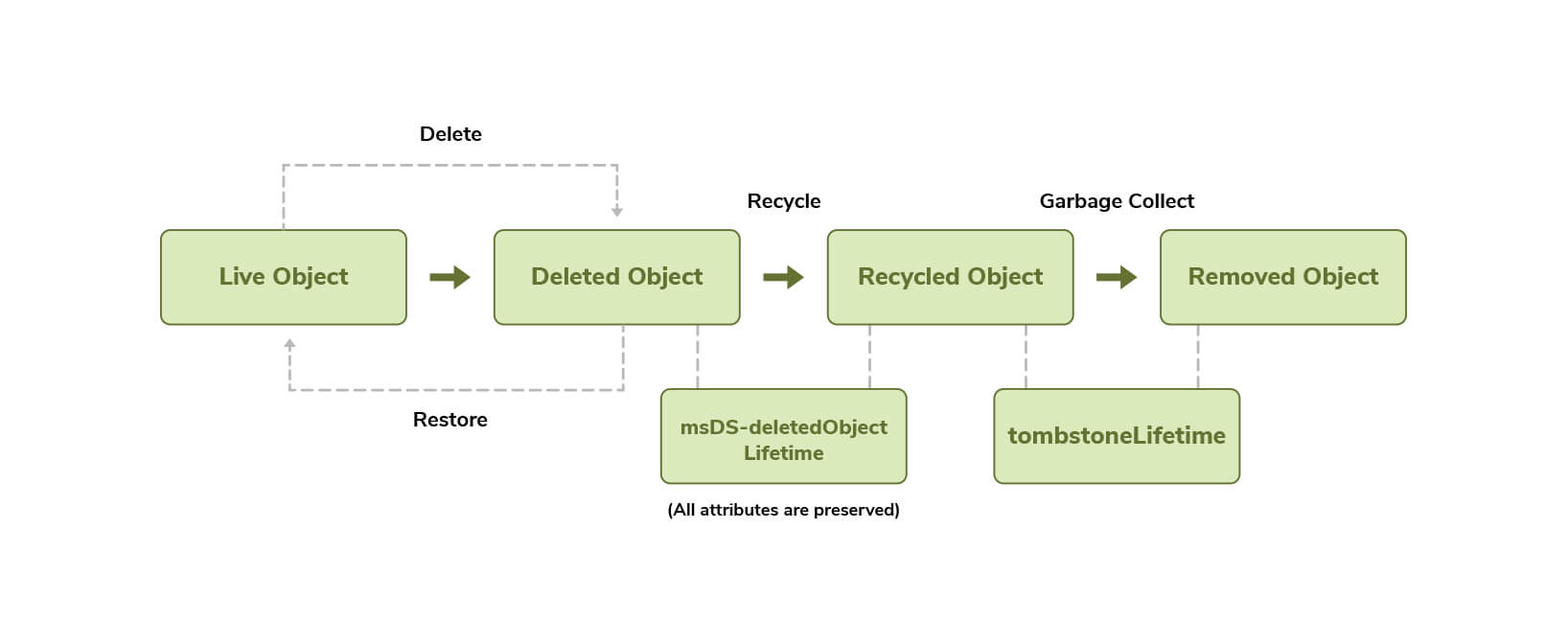 Quando o período msDS-deletedObjectLifetime expirar, o objeto será movido para um estado Objeto reciclado, no qual quase todos os seus atributos são removidos. Os objetos permanecem nesse estado conforme especificado pelo seu atributo tombstoneLifetime. Depois que o período tombstoneLifetime expira, o objeto é removido do banco de dados pelo processo de coleta de lixo e não pode ser restaurado.