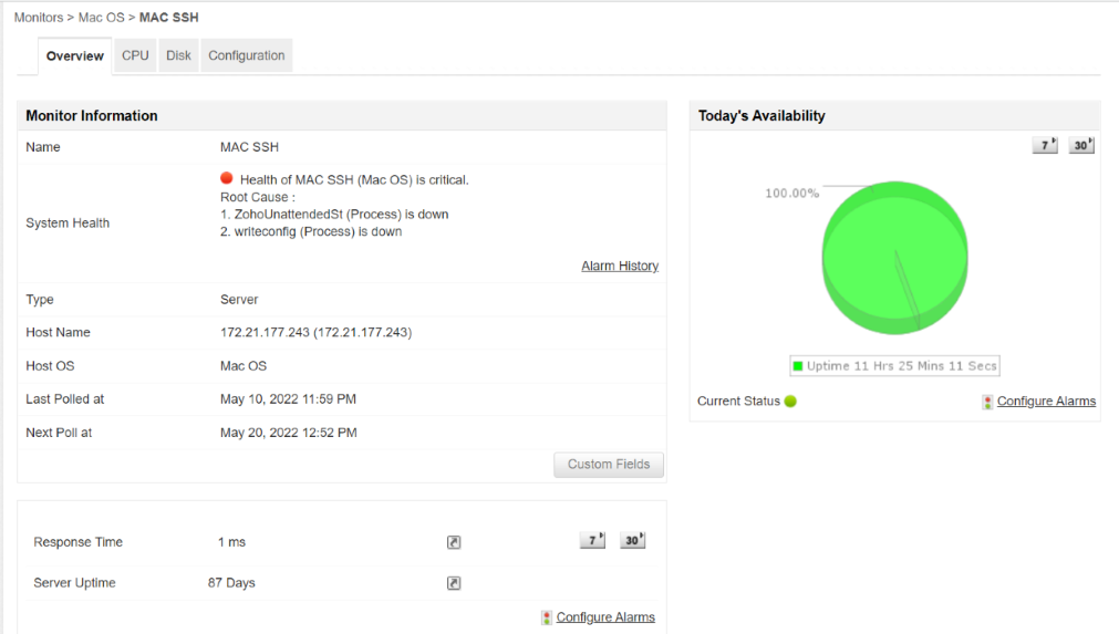 O recurso de monitoramento do macOS do Applications Manager ajuda você a rastrear e otimizar o desempenho do seu servidor do macOS e garante a disponibilidade 24 horas por dia, 7 dias por semana, por meio do monitoramento em tempo real.