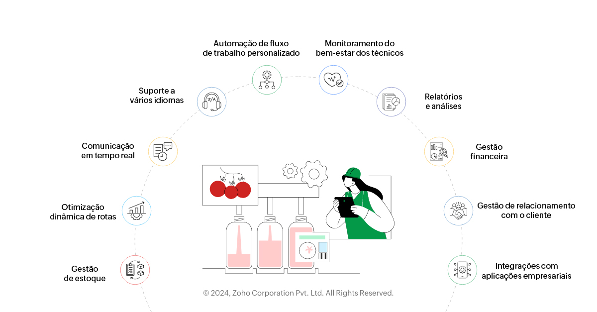 O gerenciamento de field services consiste em gerenciar equipes que trabalham fora do escritório. Essa equipe inclui técnicos, prestadores de serviço e pessoal de manutenção. Essencialmente, é o sistema que mantém suas operações sob controle. Ele abrange tudo, como agendamento de tarefas, despacho, rastreamento, relatórios e até mesmo faturamento.