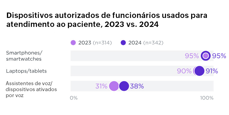 Os profissionais da saúde usam muitos dispositivos, desde estações de trabalho clínicas e tablets de visita médica até PCs integrados a equipamentos médicos e dispositivos especializados com código de barras. O relatório Digital Health Most Wired National Trends 2024 revela que, embora os dispositivos móveis de atendimento ao paciente estejam sendo amplamente adotados, também houve uma mudança para o aumento da adoção de dispositivos de propriedade do funcionário. Isso indica uma preferência entre os profissionais por um ambiente de atendimento mais flexível e orientado pela tecnologia.