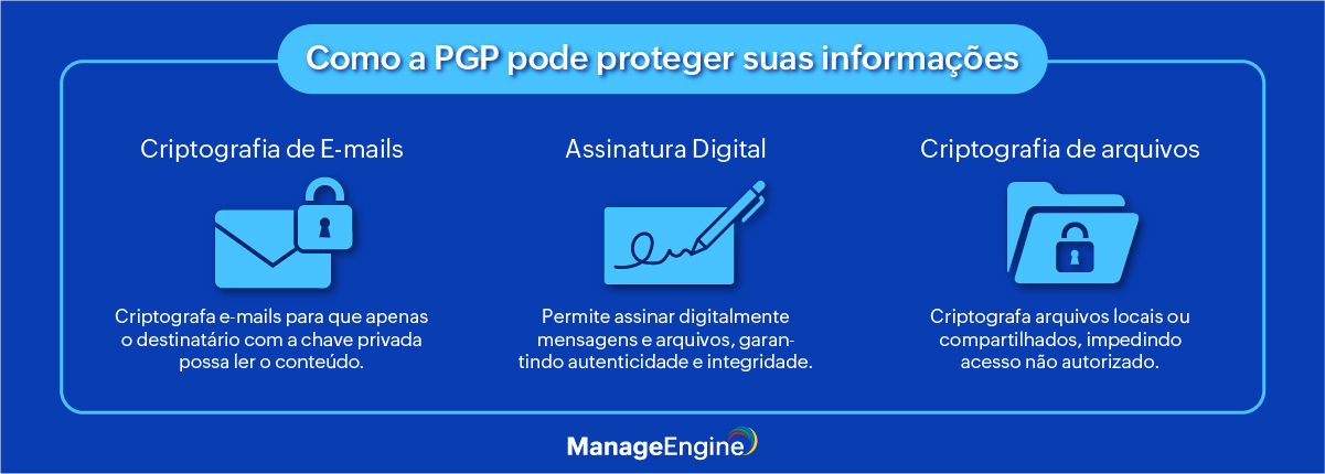 Além da garantia de segurança, o PGP habilita a assinatura digital, que comprova a autenticidade do remetente e assegura que o conteúdo recebido não foi alterado durante o processo de envio.