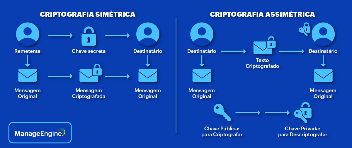 Já a criptografia simétrica utiliza uma única chave, tanto para cifrar quanto para decifrar a informação, tornando o processo mais rápido e eficiente para o tratamento de grandes volumes de dados.