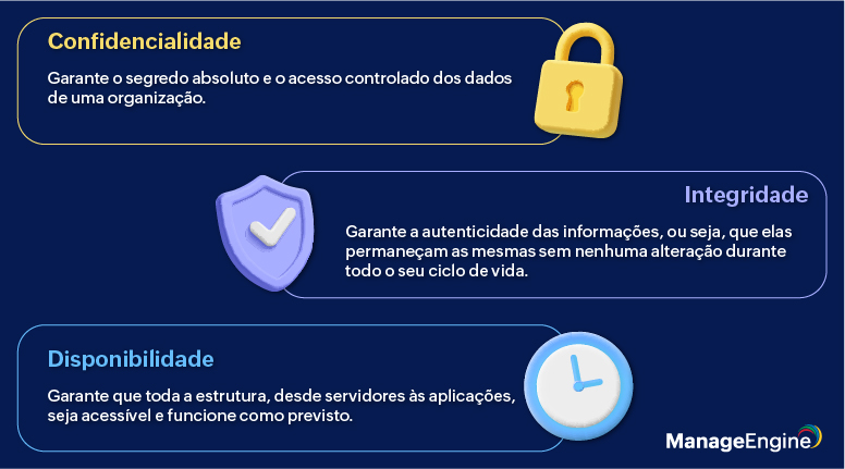 Três princípios compõem a tríade como um todo. Cada um deles é responsável por uma etapa do processo de segurança digital. Conheça-os abaixo: