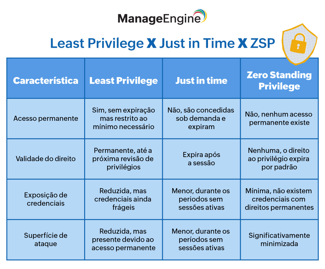 Apesar dos conceitos estarem intimamente relacionados, Least Privilege, Just in Time e ZSP focam em categorias distintas do gerenciamento de acesso privilegiado.