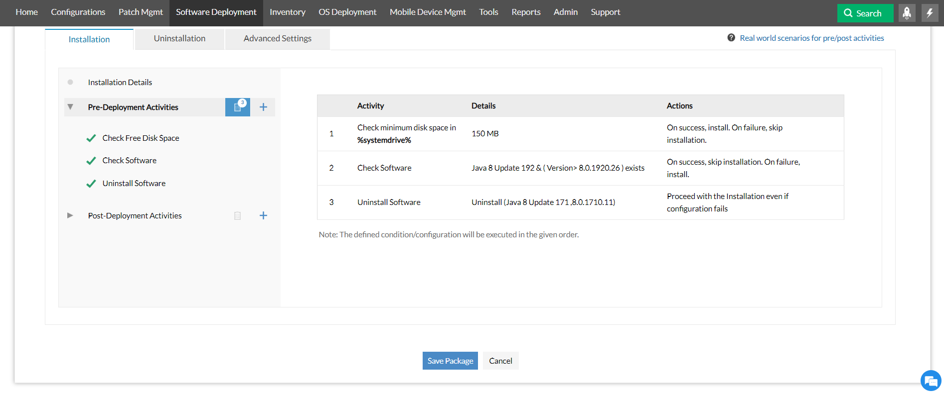 As estratégias de implantação consideram um plano de ação ou conjunto de pré-requisitos que precisam ser seguidos para instalar ou desinstalar softwares e aplicações com sucesso. Escolher uma estratégia de implantação de software é fundamental quando se trata de implantar pacotes de software em uma rede. Isso envolve uma lista de tarefas que devem ser verificadas para garantir a instalação ou desinstalação bem-sucedida de software(s) em vários endpoints. Pode ser uma verificação de espaço livre em disco, criação de um atalho após a instalação ou execução de um script personalizado. Essas tarefas e verificações formam a base de uma estratégia de implantação de software. Elas são categorizadas como atividades pré e pós-implantação. Você pode usar esta lista de verificação de melhores práticas de implantação de software ao configurar um pacote de software.