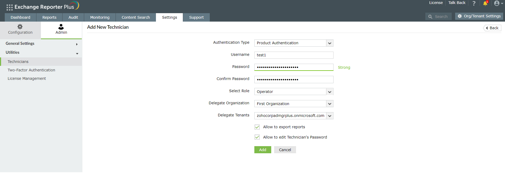 Observação: A conta de administrador padrão com autenticação do Exchange Reporter Plus não pode ser excluída ou modificada.