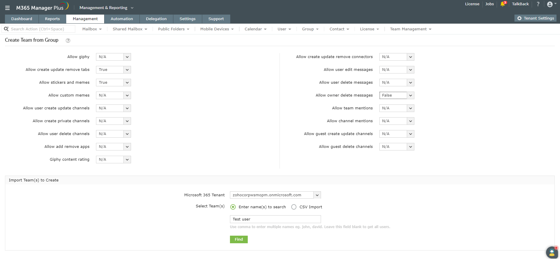 Usar o PowerShell para gerenciar o Microsoft Teams requer que você tenha as permissões apropriadas. Também pode ser complexo, demorado e sujeito a erros. O M365 Manager Plus ajuda a simplificar o gerenciamento do Teams com seu recurso de gerenciamento em massa.