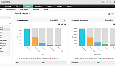 O OpManager coleta e analisa os registros dos dispositivos de segurança e gera relatórios de segurança e de largura de banda. Ele apresenta um quadro detalhado das atividades de vírus, spam e ataques ocorridos na rede nos relatórios de segurança do firewall. Responde quem está usando a largura de banda, para que finalidade, quais protocolos usados, URLs visitados e consumo de largura de banda em tempo real. Analisa o uso e o não uso de regras e políticas para detectar anomalias, gera relatórios para otimizar políticas e sugerir a reordenação de regras e políticas. Alertas para limites de largura de banda, eventos de segurança anômalos e qualquer evento de segurança de seu interesse.