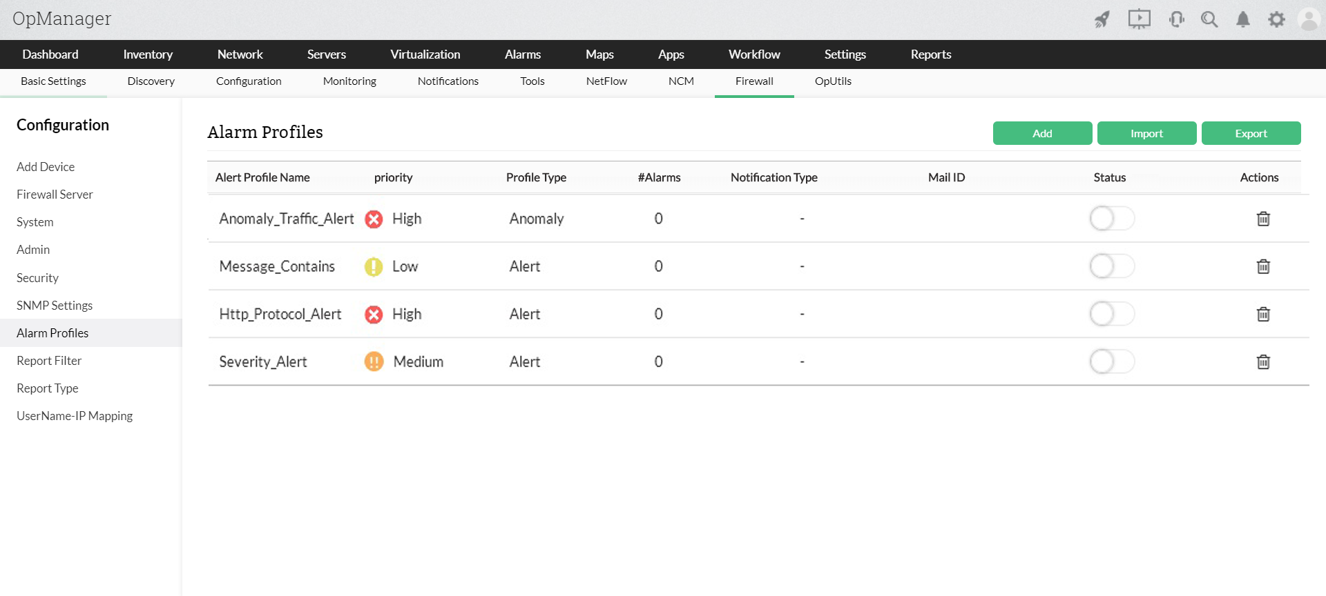 O OpManager oferece uma maneira fácil de salvar o relatório e os perfis de alerta. Você pode exportar os perfis e salvá-los. Você pode importar os perfis para recuperá-los. Isso será útil em caso de exigências, como quando você está movendo o servidor para uma máquina diferente etc.