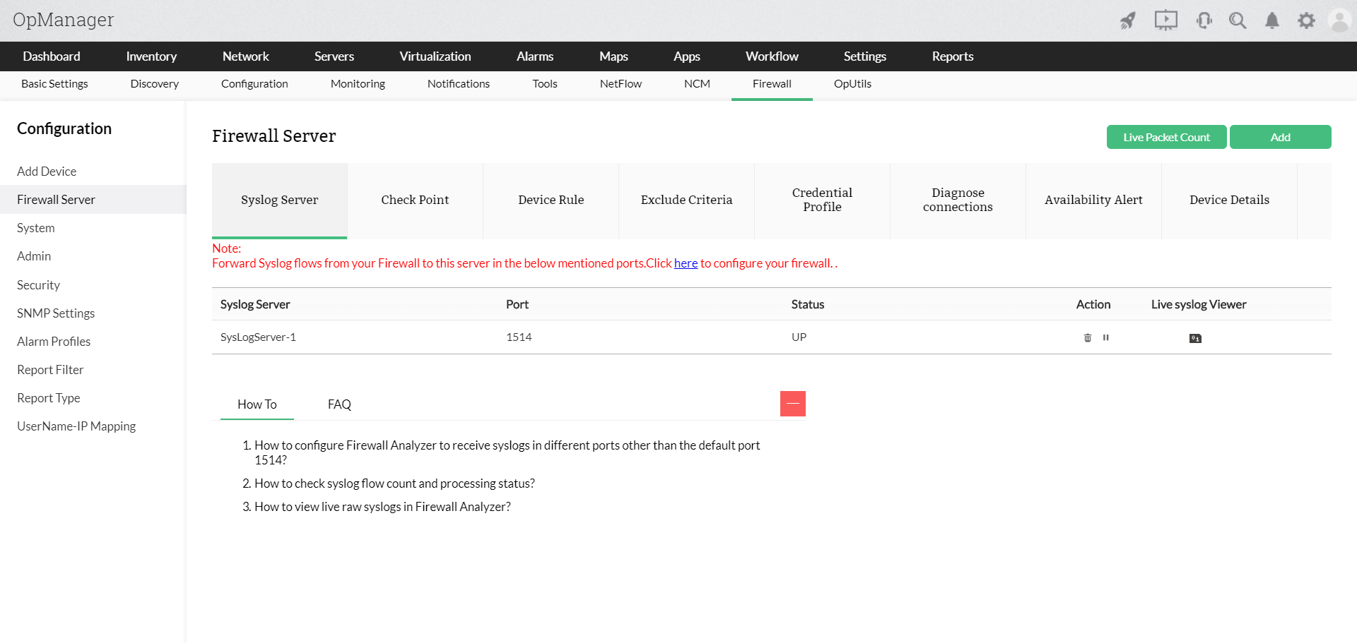 O OpManager vem pré-empacotado com um servidor syslog que escuta os logs de firewall encaminhados nas portas de escuta definidas. Você pode adicionar mais portas de escuta a este servidor syslog, para coletar logs de diferentes firewalls. O servidor syslog faz parte do OpManager e não requer uma instalação separada.
