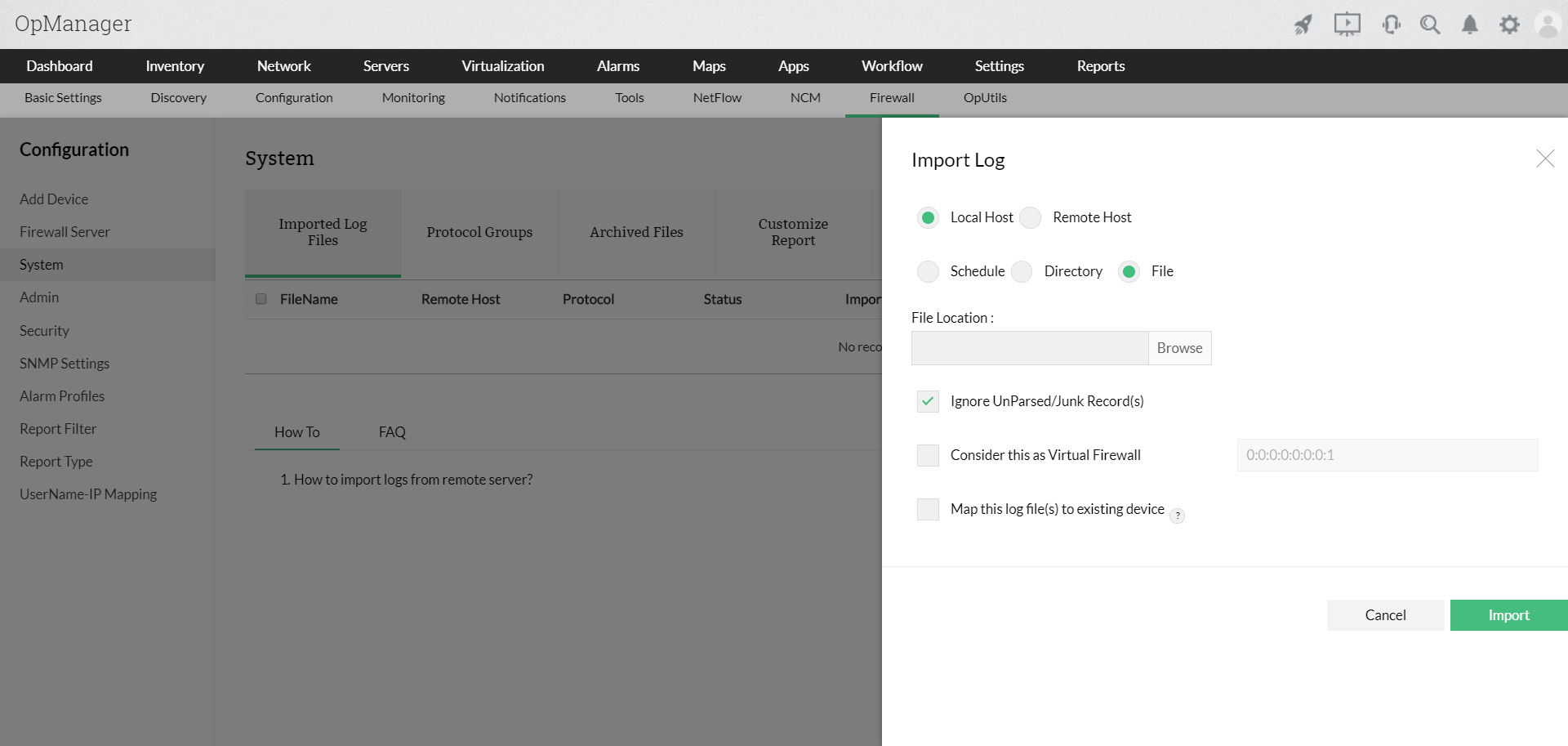 No caso de firewalls e outros dispositivos de segurança que não encaminham logs, você pode importar arquivos de logs diretamente para o OpManager e gerar relatórios para isso.