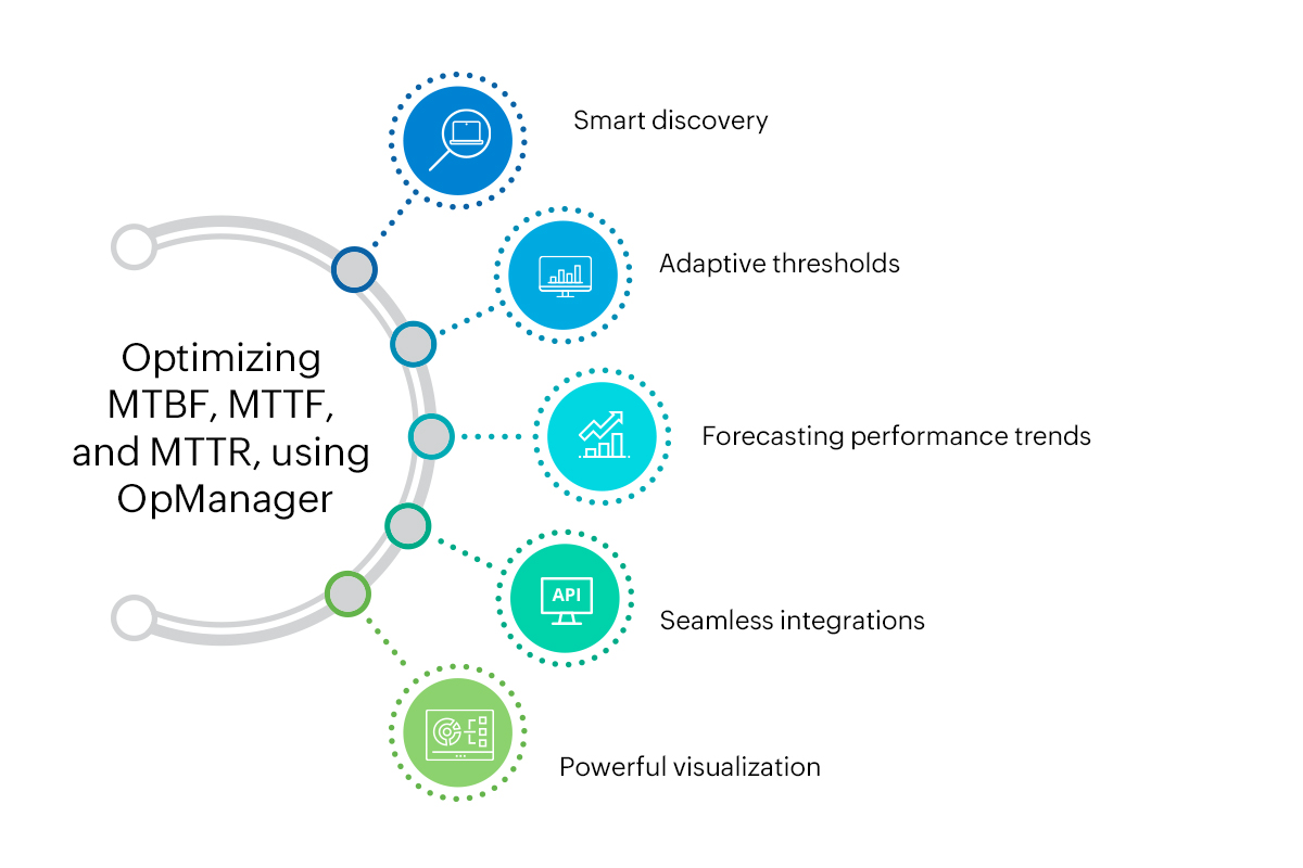O OpManager oferece as seguintes funcionalidades para o ajudar a melhorar o MTTF, enquanto reduz o MTBF e o MTTR.