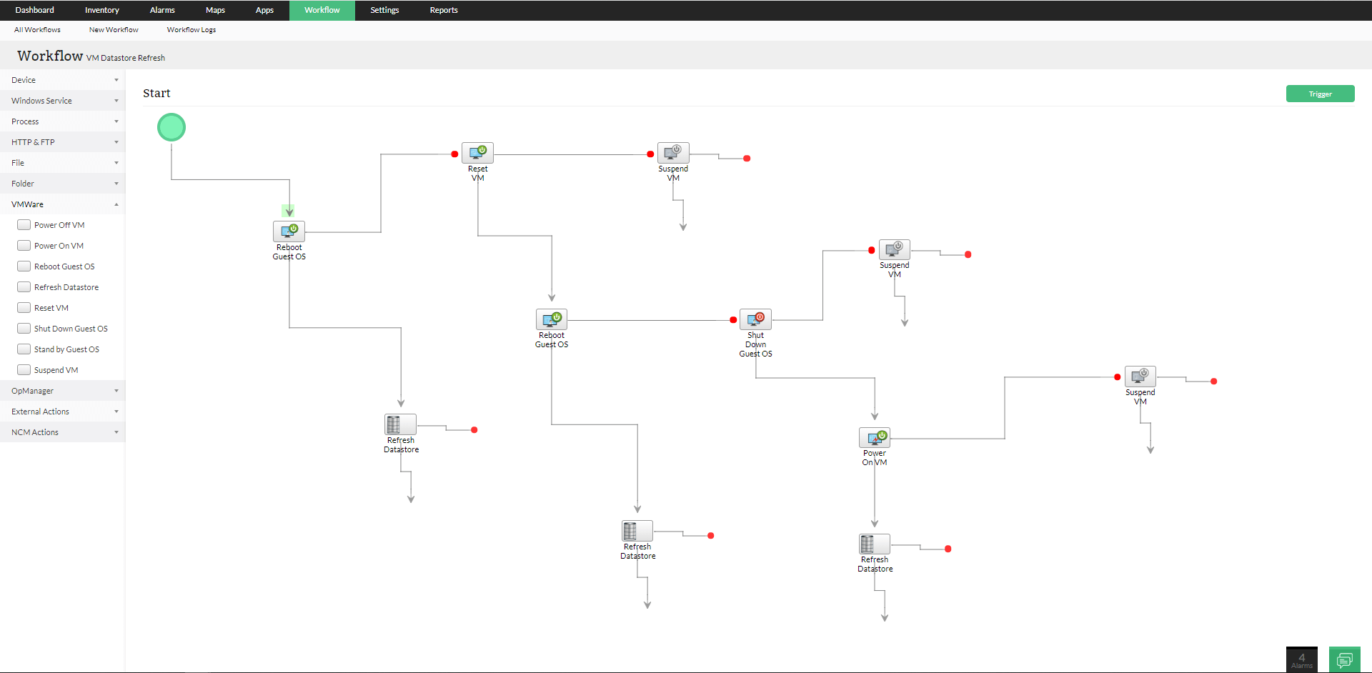 Monitore máquinas virtuais em qualquer lugar com notificações instantâneas via SMS ou e-mail sobre problemas de desempenho, falhas e tempo de inatividade com o OpManager. Você pode executar tarefas instantâneas de solução de problemas e correção em máquinas virtuais usando o recurso avançado de automação de fluxo de trabalho. Com eles, você pode automatizar e executar determinadas ações com base no perfil de acionamento configurado para as falhas relacionadas. Isso ajuda a iniciar melhores atividades de gerenciamento de falhas e automatiza tarefas que requerem intervenção manual por mais tempo.