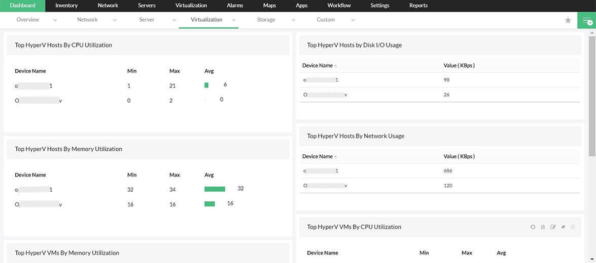O software de monitoramento do VMware do OpManager exibe a listagem dos "Melhores hosts" com base no consumo de CPU, consumo de Memória swap etc. traz foco imediato nos servidores ESX "não íntegros". Os administradores podem então abrir painéis individuais do servidor ESX para investigar mais sobre os recursos e o inventário da VM. Os "alarmes recentes" e os "relatórios de histórico" encontrados na mesma página de instantâneos permitem a rápida solução de problemas, por exemplo, um alarme de alta utilização da CPU leva aos relatórios mostrando qual CPU principal atingiu o pico e qual VM contribuiu mais naquele momento.