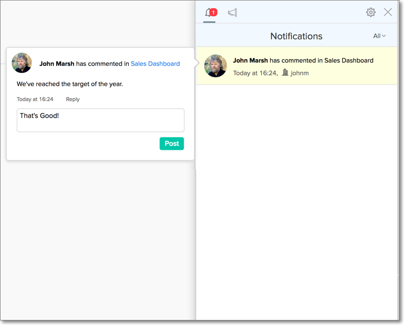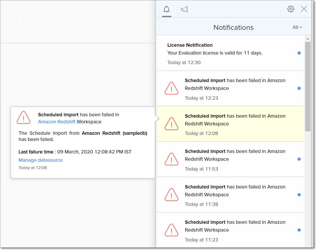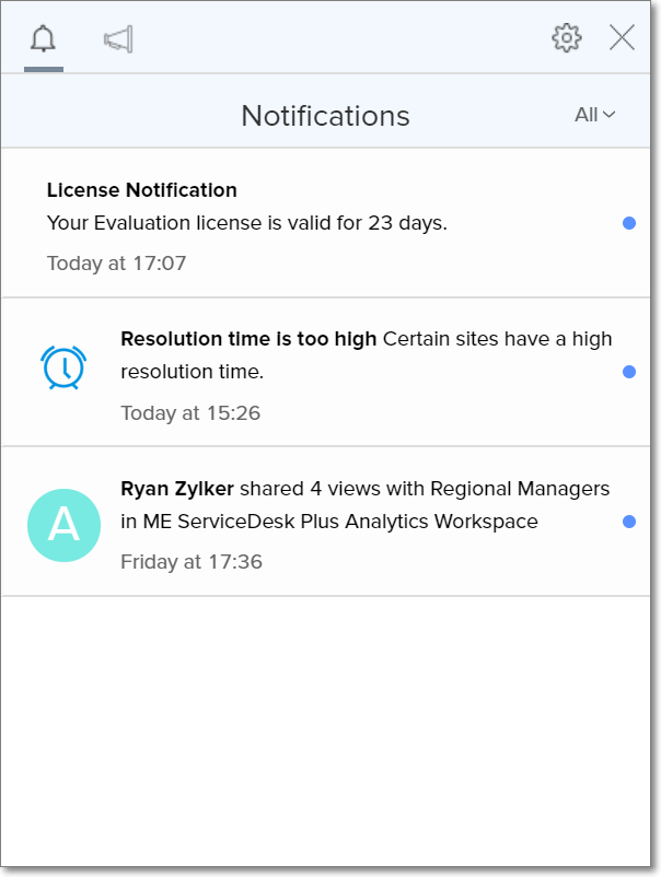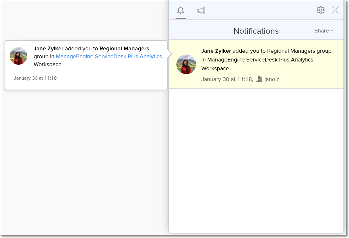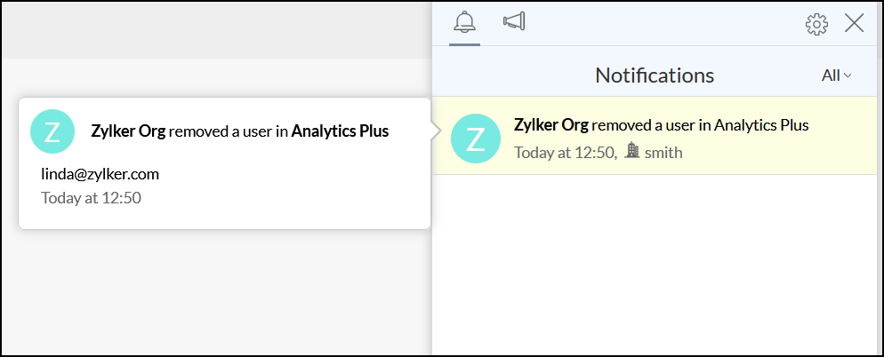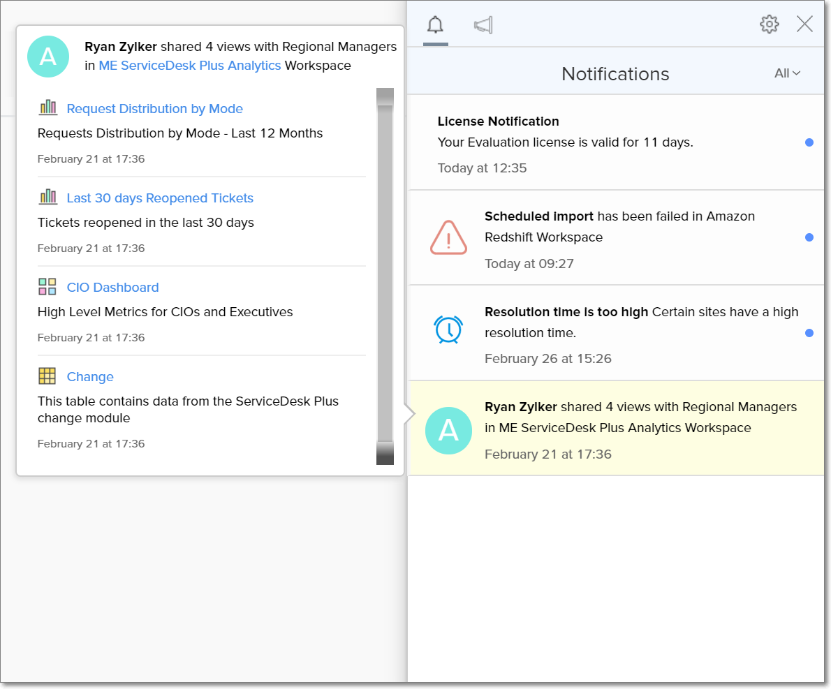 The notification feed in your Analytics Plus account notifies you instantly about any new activities performed on Analytics Plus. You can access the relevant or additional information about the activities from within the Notifications feed by clicking on individual notifications.