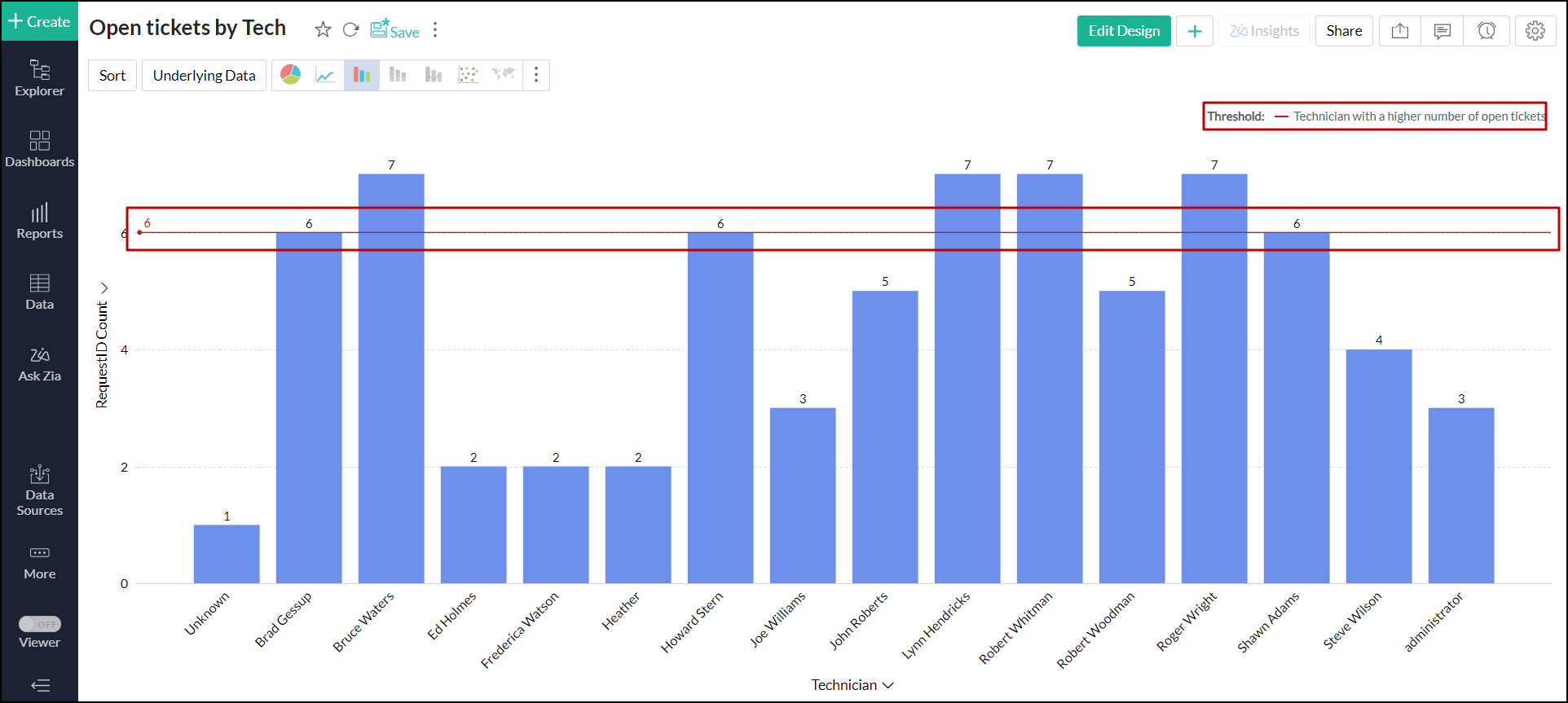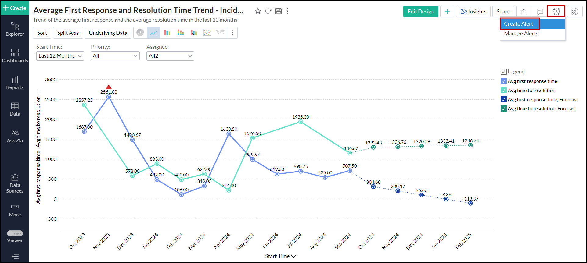 Analytics Plus allows you to set up alerts based on thresholds for specific views. A threshold is a predefined value that acts as a benchmark for data points. When values exceed this threshold, an alert is triggered, facilitating the monitoring and response to significant changes. To create alerts over thresholds, follow the steps below.