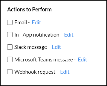• Choose the channel on which you wish to receive alert notifications. You can choose to be notified through email, in-app notification, Slack message, Microsoft Teams message, or choose to configure a webhook request. Click the corresponding links to learn more about each option.