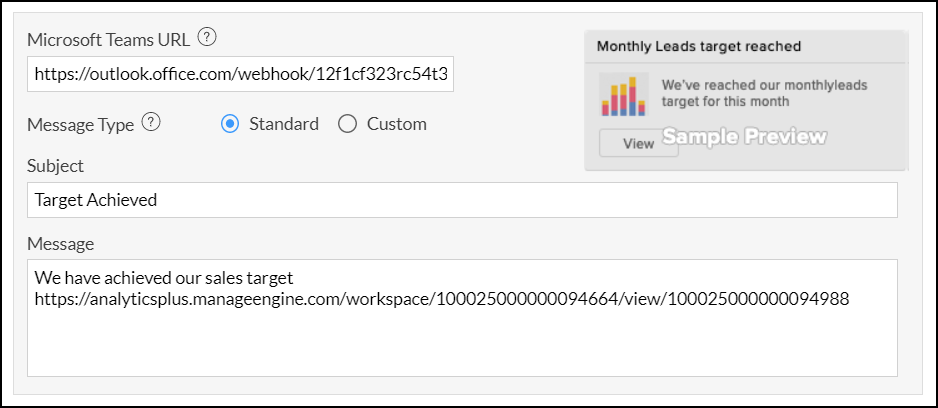 • Microsoft Teams URL: Create and enter the Microsoft Teams' incoming webhook URL. Click here to learn more about creating webhook URLs in Microsoft Teams.