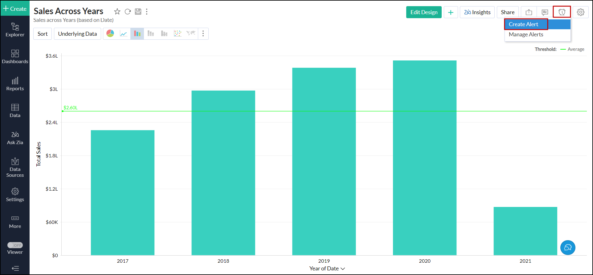 3. In the View mode of a report, click the Alert icon > Create Alert.