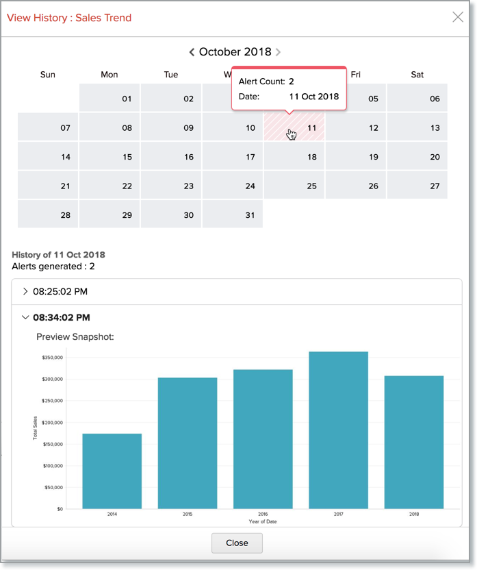 • Click the Alert History icon. A calendar view appears, highlighting the days when the alert was triggered. Clicking on these highlighted days will display the alert runtime, triggered time, and the copy of the report when the alert was triggered.