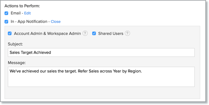 • In-app notification: This option enables you to notify the Account Administrator, Workspace Admin, and the shared users of the respective report.