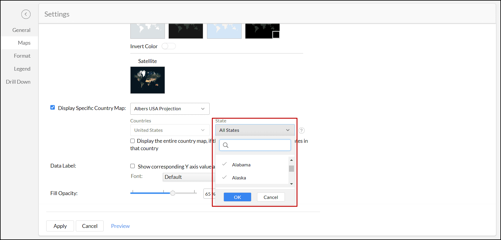 - Fill Opacity: You can specify the opacity of the chart series color. This option does not apply to Map-Scatter charts.