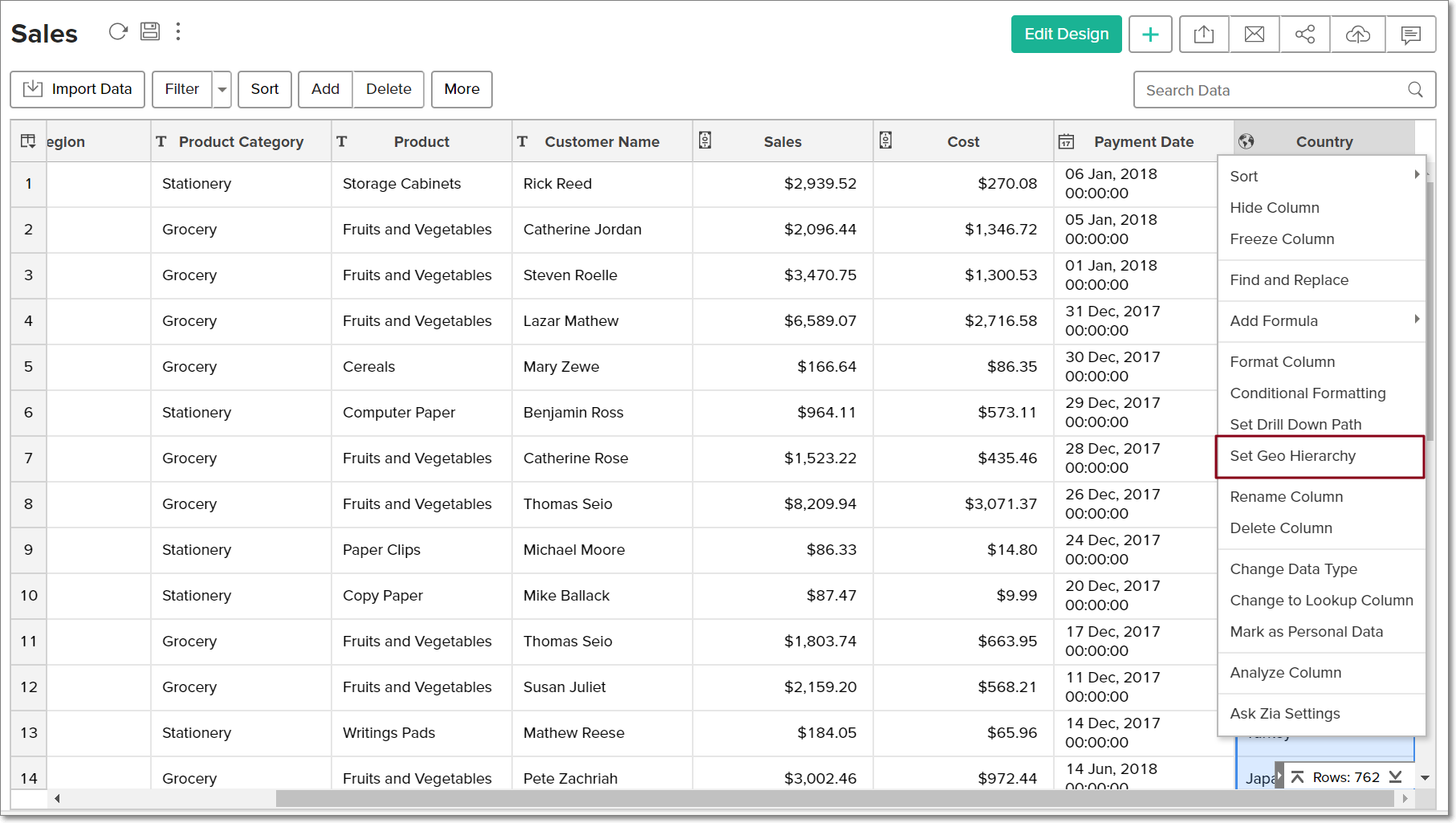 Analytics Plus will auto-identify geographical columns i.e. columns that contain information about continents, countries, counties, states/provinces and cities. However, to create map charts using columns containing zip code, or latitude and longitude, the data type of the column needs to be changed manually. To do this,