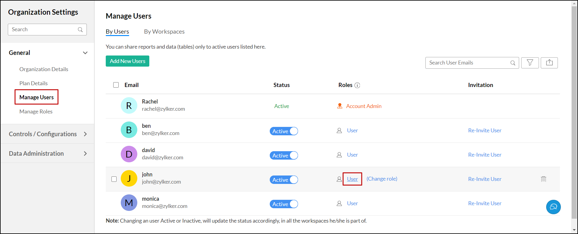 To change an existing organization administrator, workspace administrator, or viewer to a custom role, you need to change them as User initially. To do this, follow the steps below.