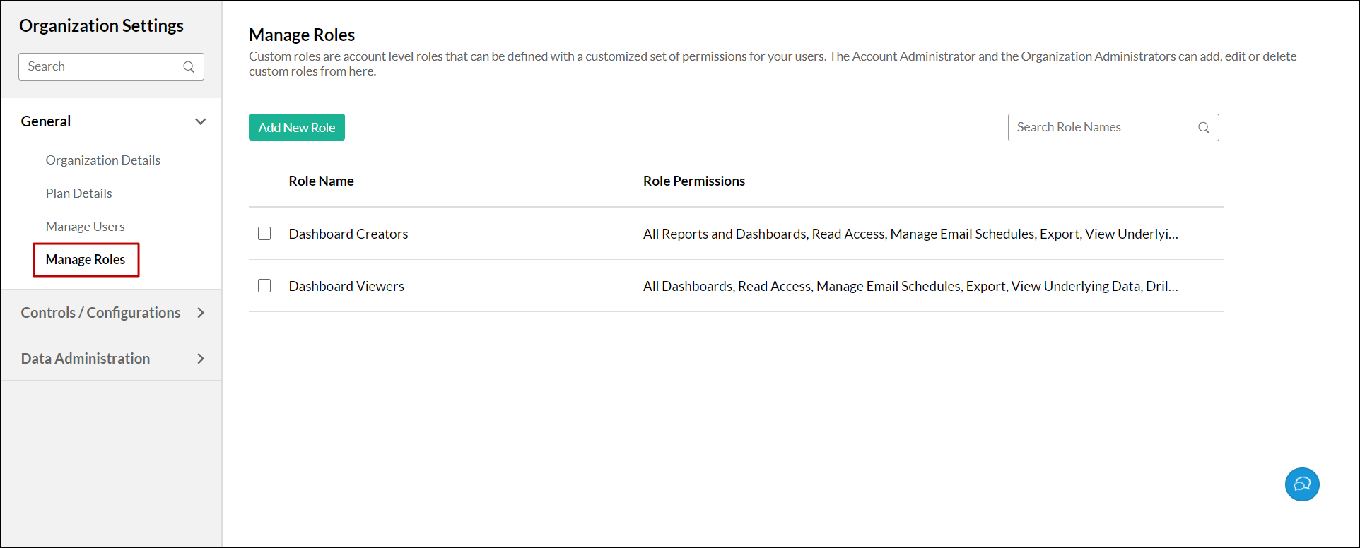 Analytics Plus lets the account administrator and organization administrator manage the custom roles. Follow the steps below to do this.