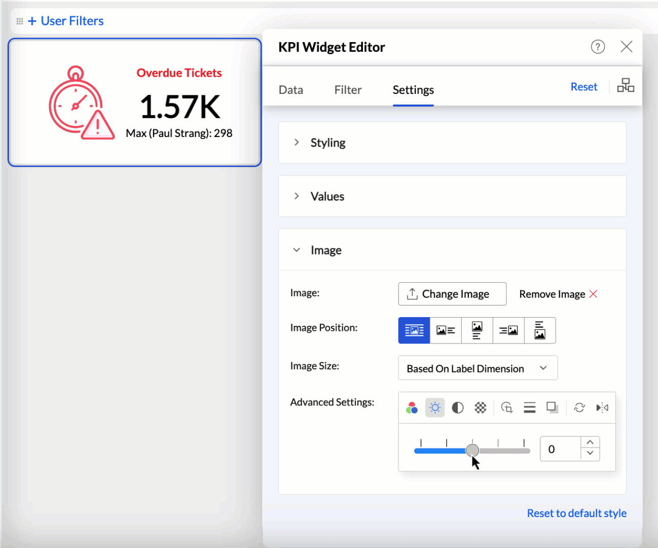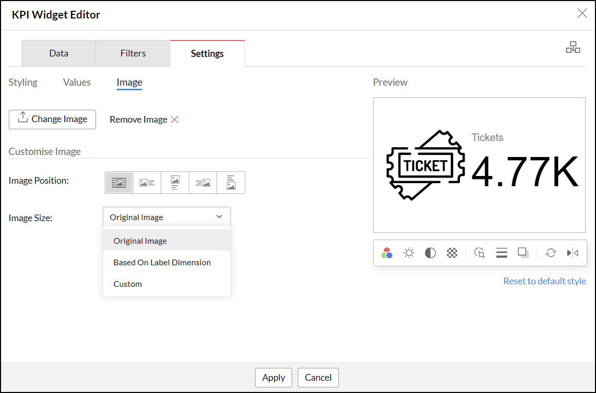 To revert any changes made to the image or icon, click the Reset to default style link at the bottom of the image editor.