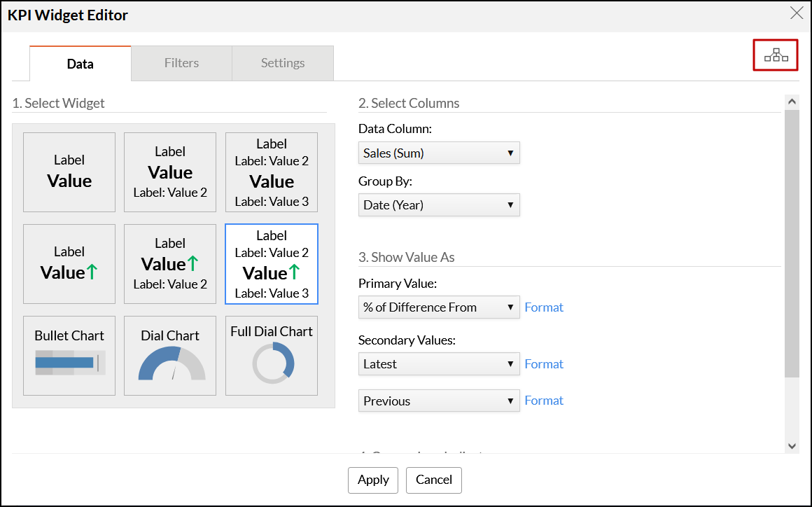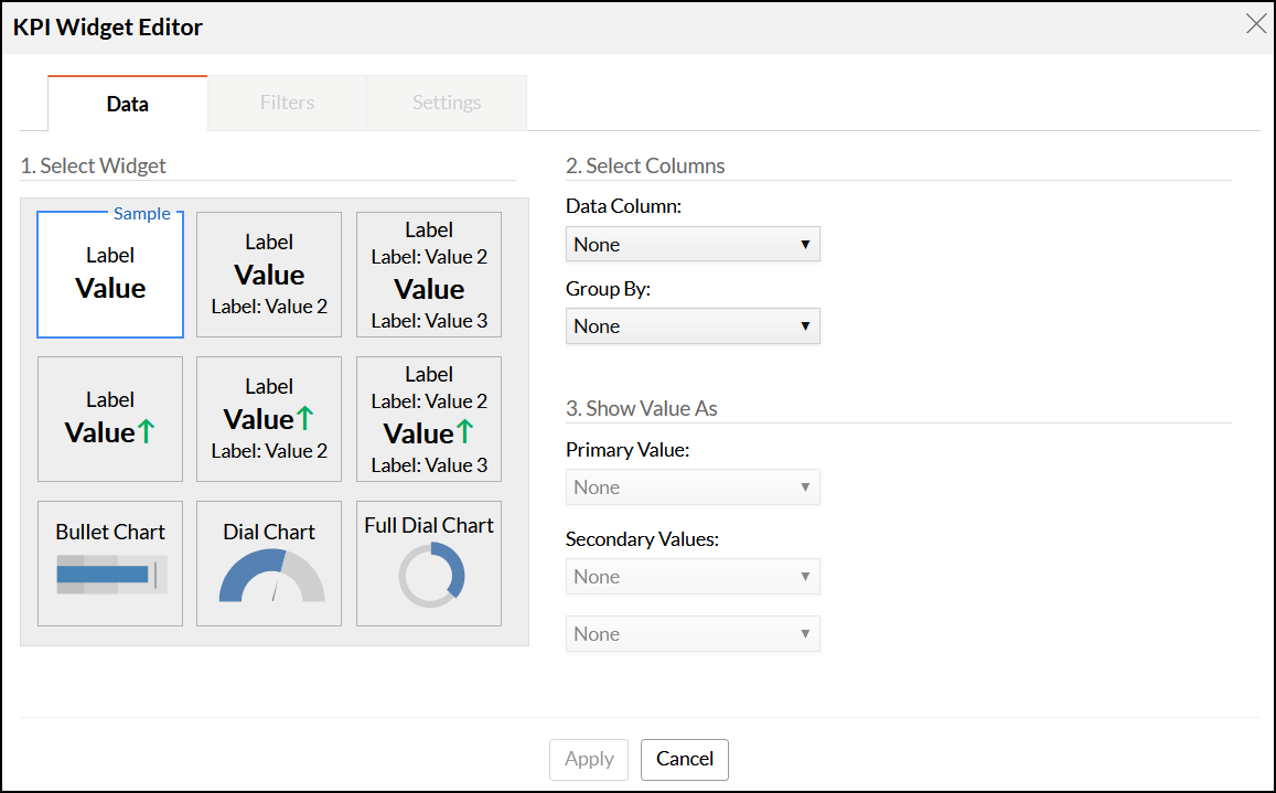 The Data tab provides options to add a primary key performance indicator and secondary values to support it. You can choose the type of widget and the required columns from this section.