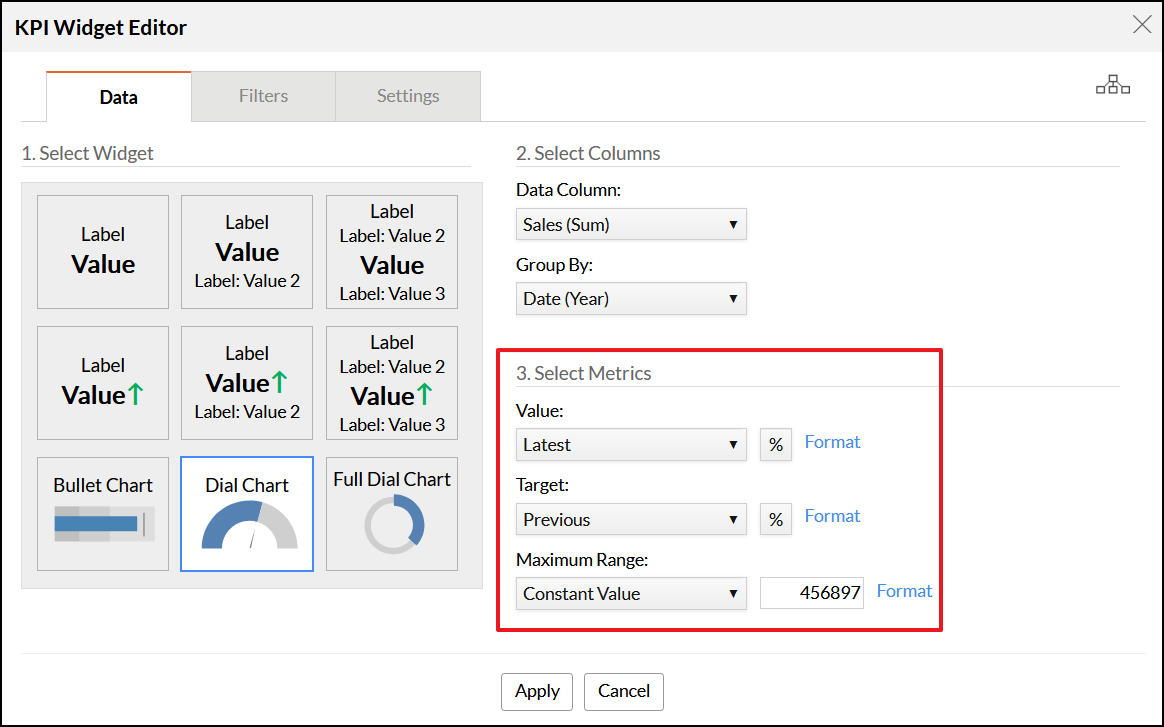 - Maximum Range: You can specify a maximum range for the widget using this section. You can either choose to apply summary functions or specify a constant value in this field.