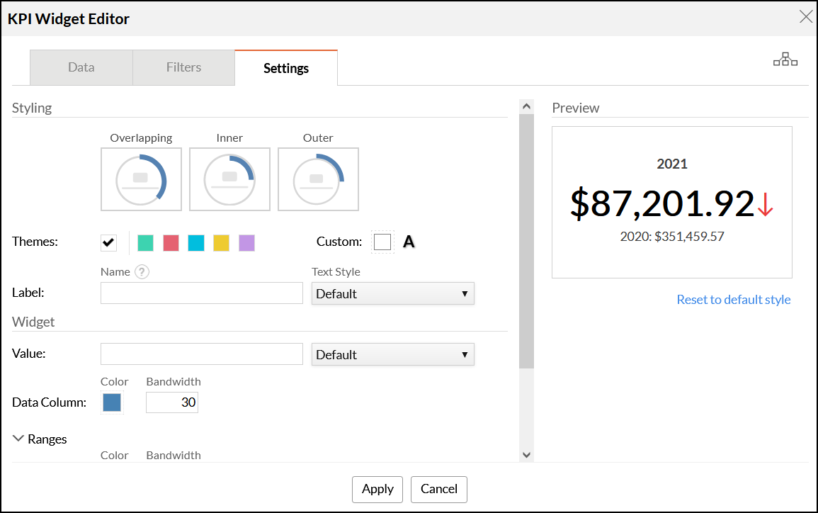 Ranges are hues that are displayed in the background of a chart type widget to highlight the primary value. Analytics Plus allows you to specify different ranges to visually categorize primary values. For instance, you can use different hues to categorize performance as poor, satisfactory, and good. The color and bandwidth of these ranges can be customized from the Ranges section in the Settings tab
