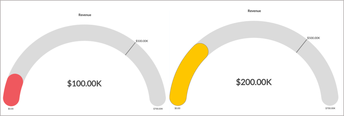 Speedometer: The speedometer is a dial chart with an indicator that marks the position of the key metric value in a given range. By default, the qualitative ranges in the speedometer don't follow the same hues. The red, yellow, and green colors prove beneficial in indicating your performance range.